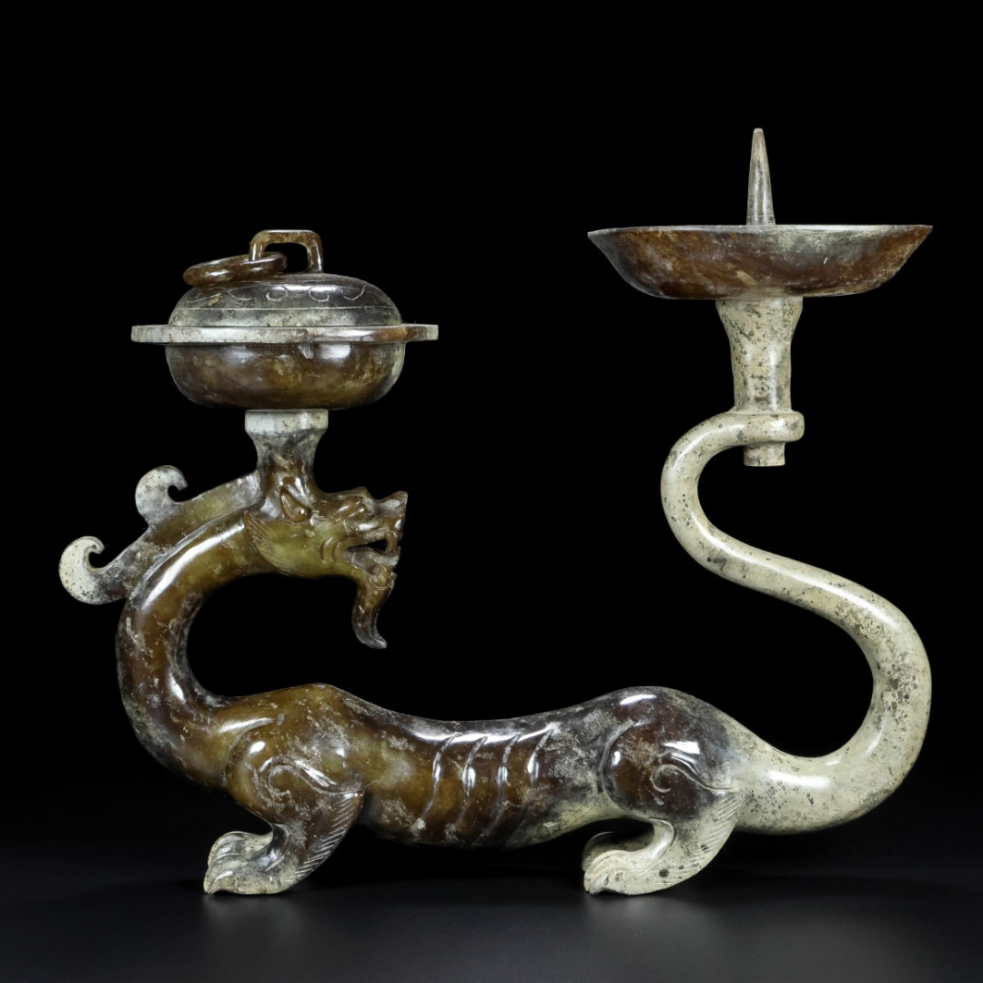 - ▽鴻▽漢朝時代 高古玉 和田玉彫 龍薫炉灯 時代物 中国古美術 骨董品
