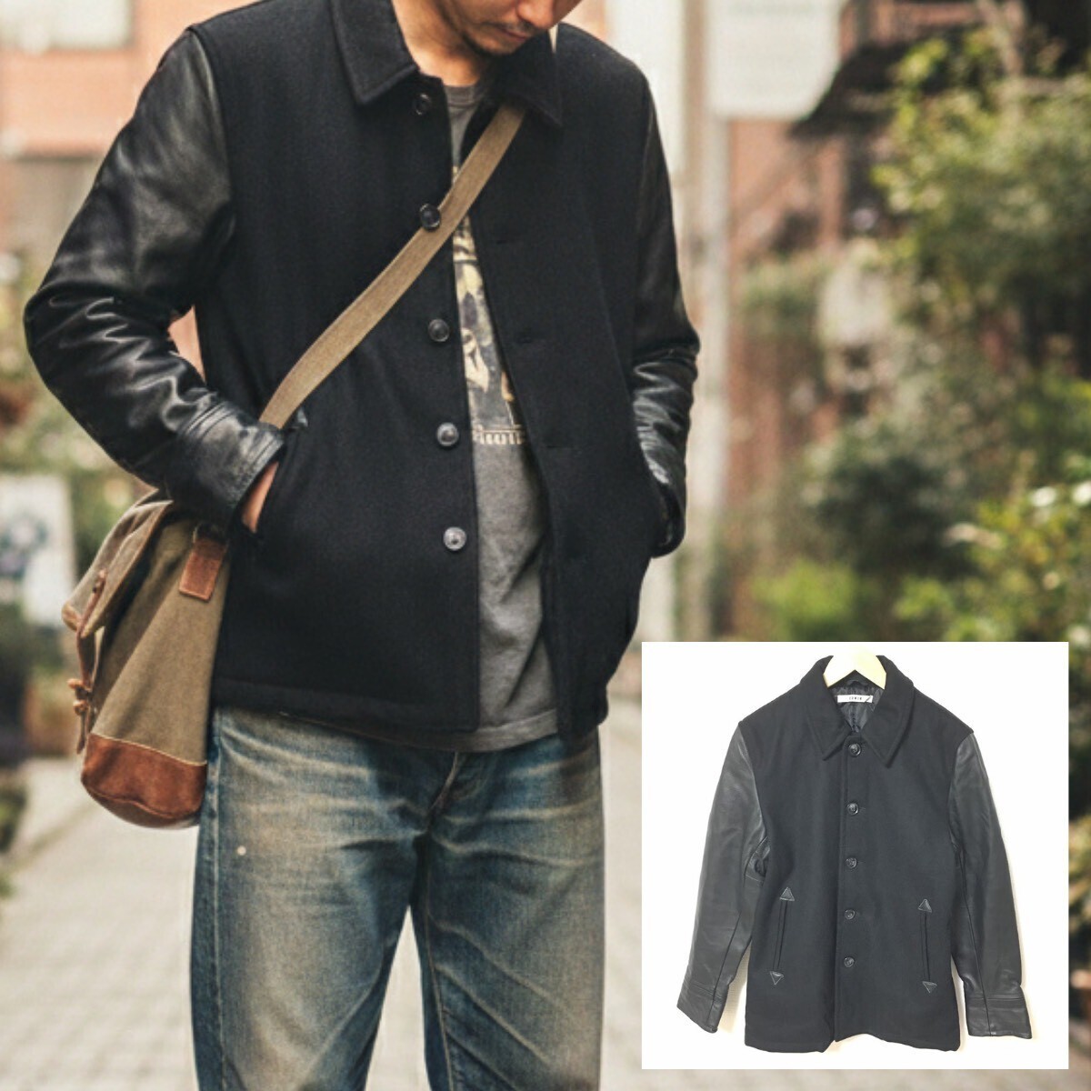 > ワイルドな大人コーデ◎【EDWIN】エドウィン レザー ブルゾン ジャケット スタジャン 本革 ウール ブラック メンズ サイズ M /Y36966fa