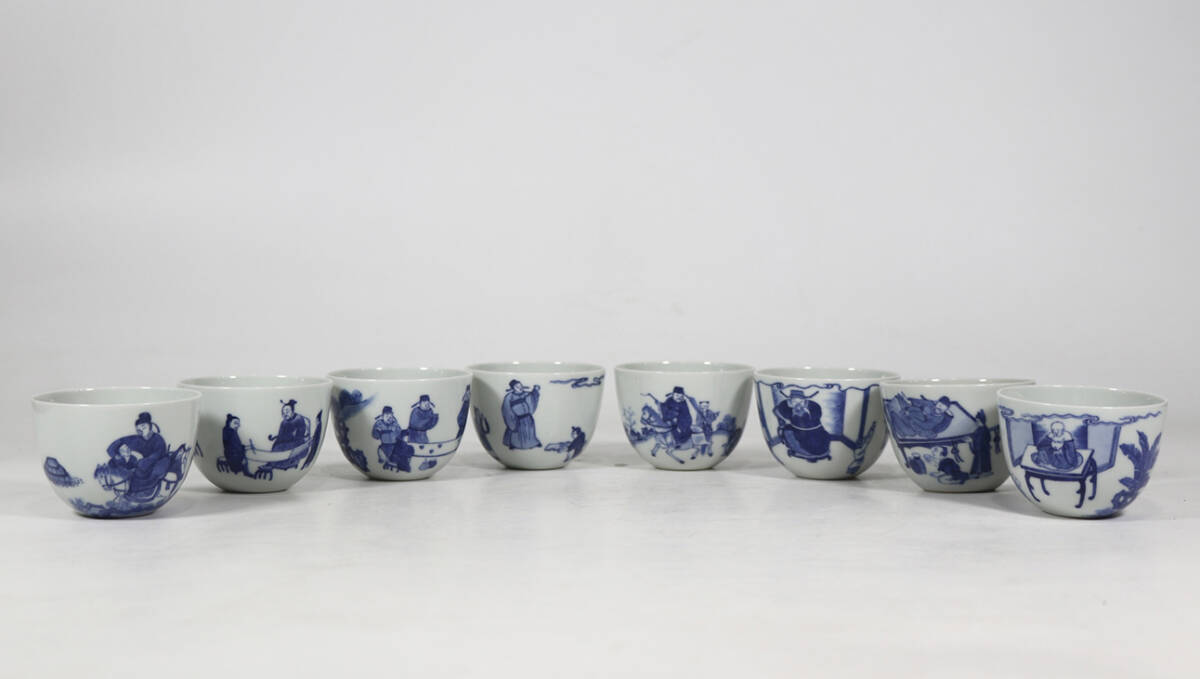> ▽鴻▽清朝時代 陶磁器 青花飲中八仙漢詩紋臥足杯セット 8点 清康熙年製款 共箱 時代物 中国古美術 骨董品
