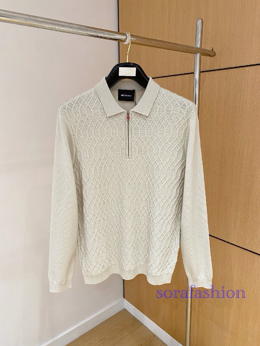 > KITON キトン メンズニットポロシャツ 長袖T-シャツ トップス ベージュ 56サイズ 紳士服 ジャガード柄 通気吸湿 紳士服 コットン 柔らか