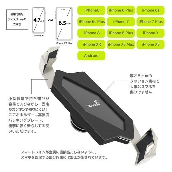 クランプは自由に角度調整が可能で、4.7~6.5インチのスマートフォンに適用します。