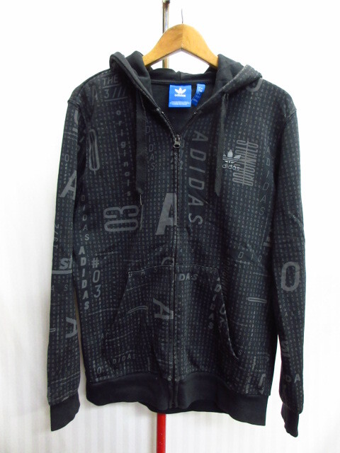> アディダス 総柄トレフォイルパーカー メンズL 黒グレー スウェットフーディー フード付きジャージトップ フーデッドトレーナー 10173
