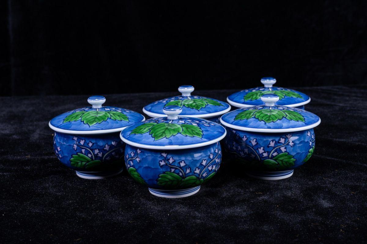 - 【珍品堂】1円から M02-P08 有田焼 館林源右衛門 染錦 牡丹唐草紋 蓋付 湯呑み 5客揃 茶器 共箱 木箱 名窯 高5.5cm 和食器 煎茶道具 茶道具