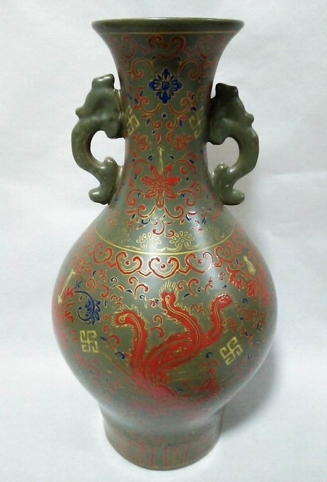 > ★【一美堂】★清雍正写★濃緑釉 色唐草 赤絵鳳凰★中国『耳付 花瓶』★高さ38cm★