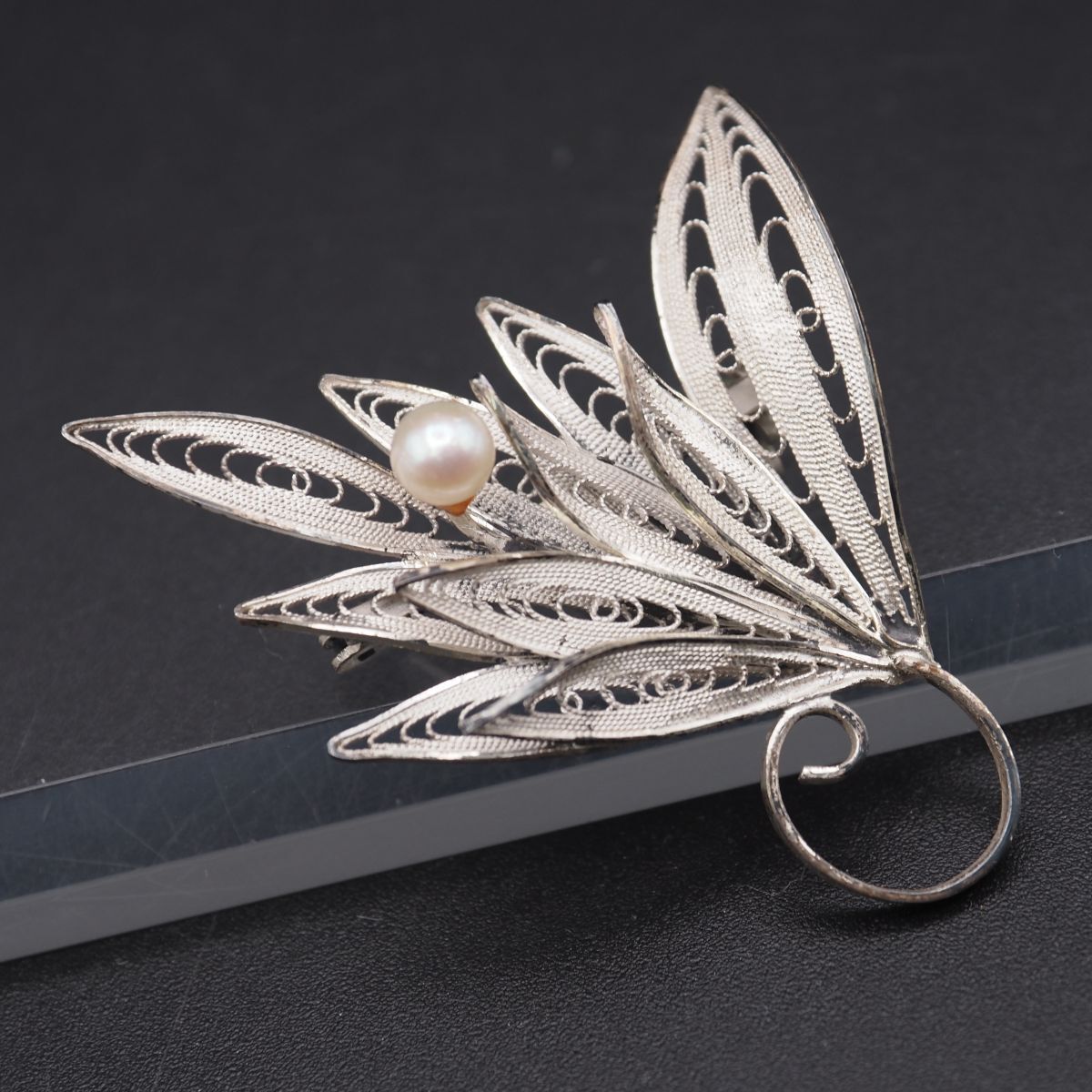 - H066 本真珠 4.8mm珠 パール SILVER刻印 ブローチ フィリグリー 銀線細工 リーフ デザイン シルバー コサージュ 6月誕生石