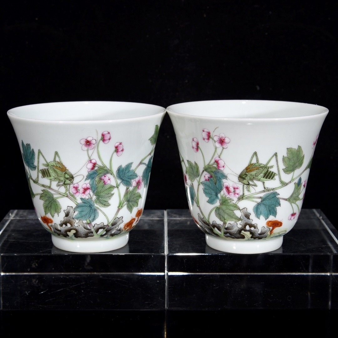 - 【永】清時代 大清雍正年製 蟲草紋杯 一対 古陶磁器 陶芸 皿 中国陶瓷器 唐瓷 置物擺件 古美術品 古賞物 収集 旧家蔵出 中国唐物 A21
