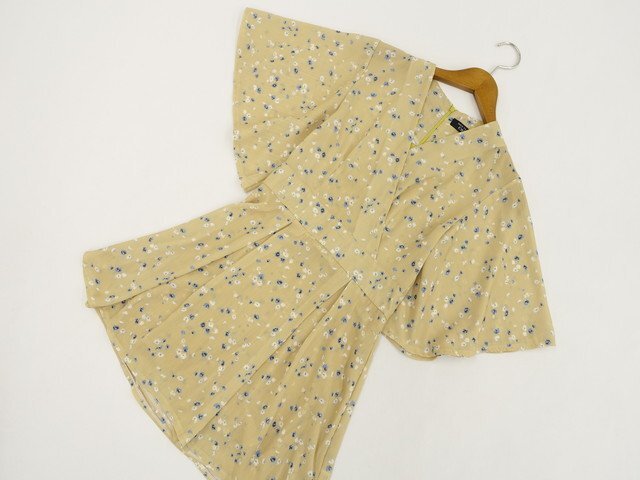 > 美品 NICE TO MEET CHUU ひざ丈 フリル 五分袖 カシュクールシフォンインナーパンツ付きワンピース ベージュ地 青×白 花柄 【メール便可】