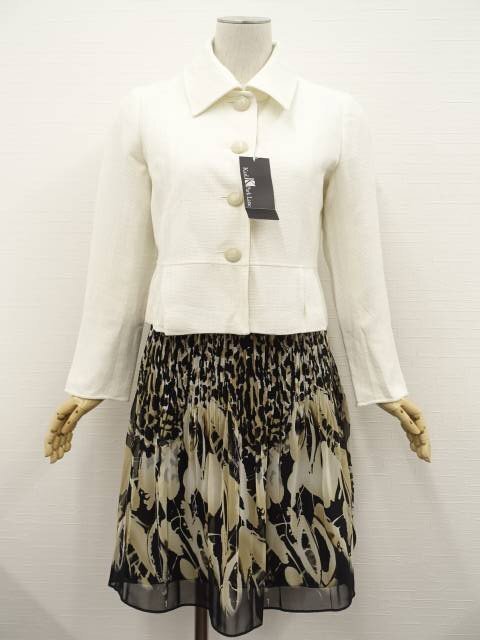 - 美品 LA.SUMER等 ツイードジャケット+膝丈変形プリーツスカート コーデ2点セット M相当 白/黒×ベージュ系 総柄 きれいめ系 30~40代