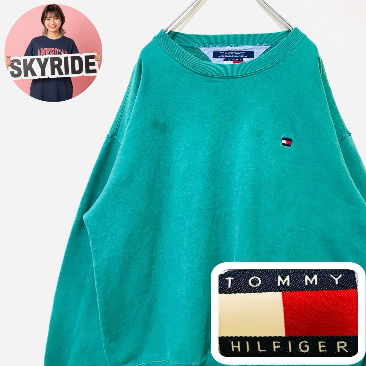 - Y2K Tommy Hilfiger トミーヒルフィガー スウェット トレーナー 刺繍ロゴ L グリーン ビッグシルエット コットン混 通年着用可 #TT0386