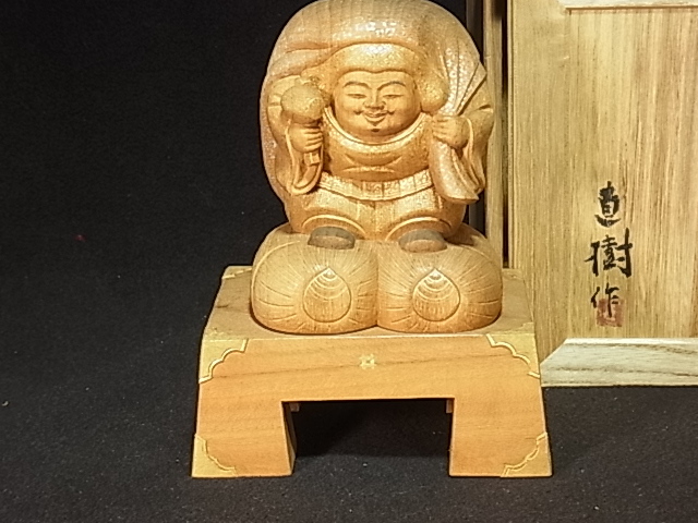 - 直樹作 木製地彫 金泥書 大黒天 台付高21㎝台付幅15×12㎝ 本体14×11×8.5㎝ 共箱有