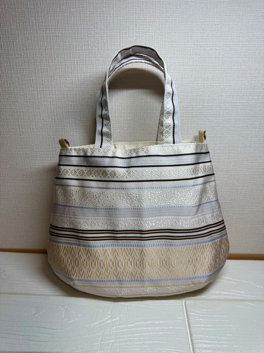 - 手提げトートショルダー2wayバッグ 帯リメイク 丸型 大きめ ハンドメイド 博多帯 ポケット付き 一点物 オフホワイト