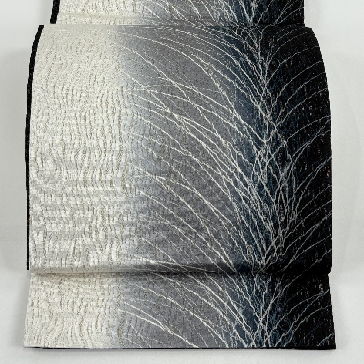 - 【美品】 袋帯 秀品 葉柄 地紋 箔 ぼかし 灰色 全通 正絹 【中古】