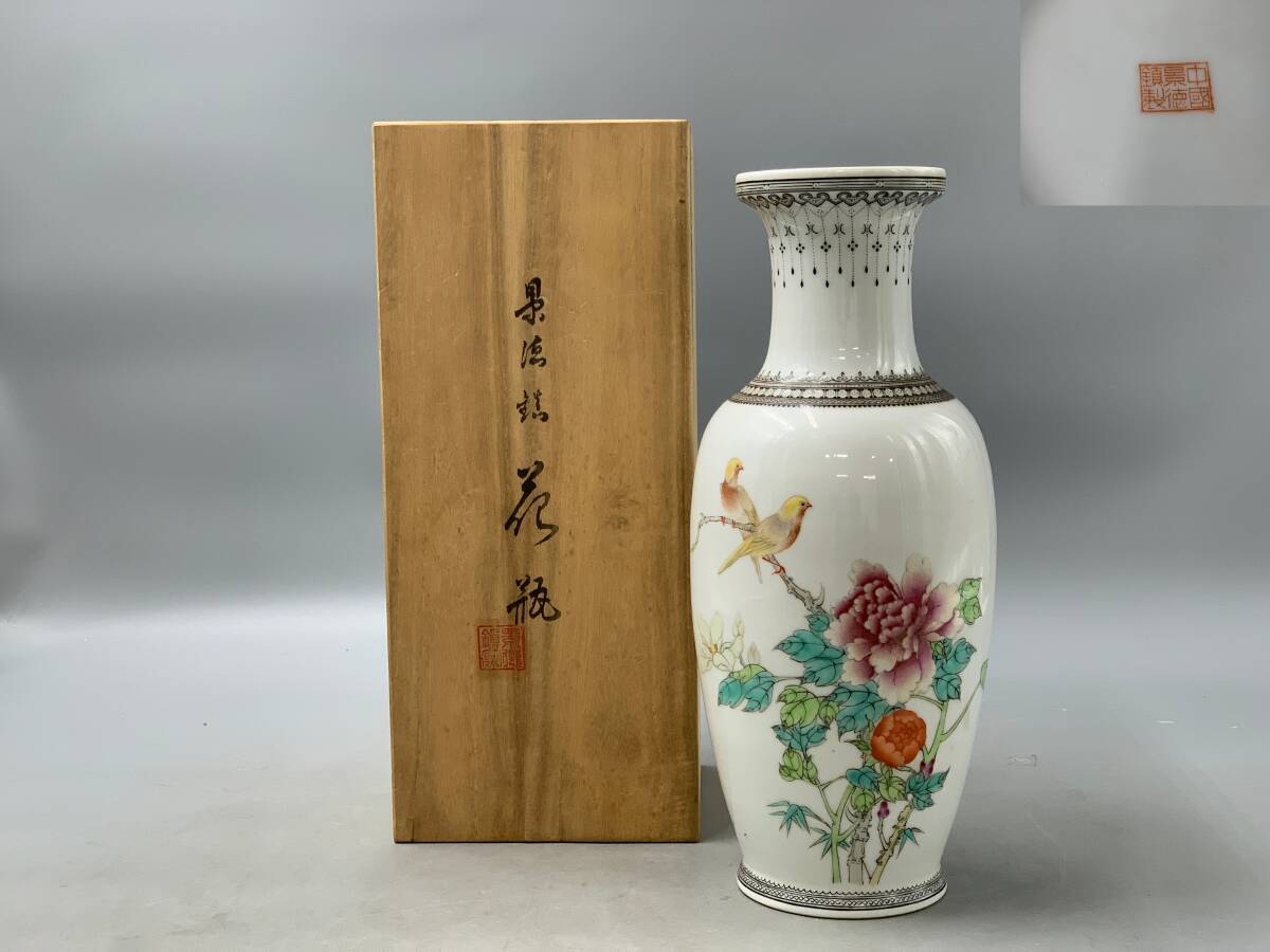 > 10#E/B151 中国古玩 中国景徳鎮製 花鳥文 花瓶 粉彩 磁器 壺 飾壷 共箱 陶磁器 80サイズ