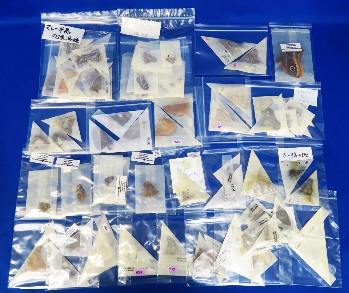 - 郵R9415◆未展翅 蝶/蛾 標本 三角紙セット(85)外国産(ベニボシシジミタテハ/マイムナウズマキタテハ/フクロウチョウ/メンガタスズメ他)一括