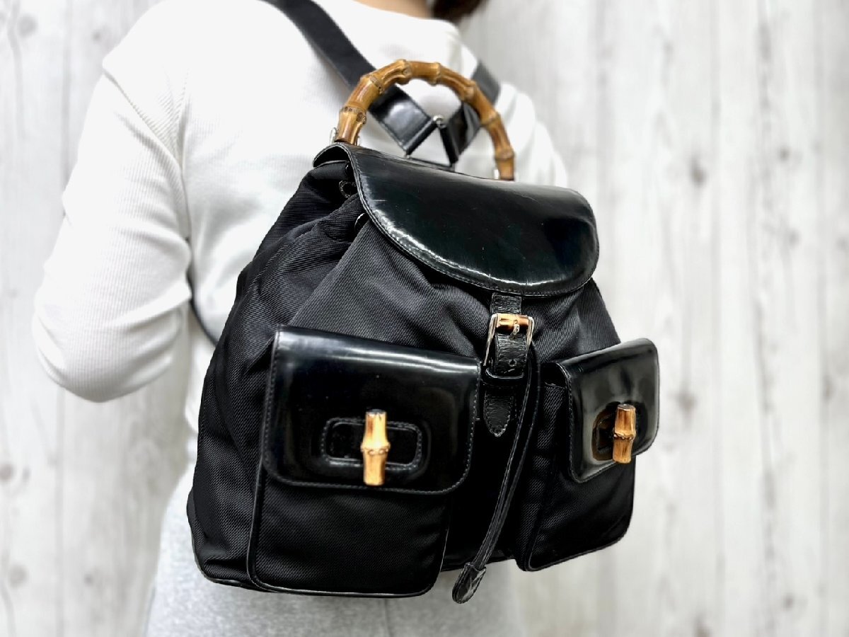 - 美品 GUCCI グッチ オールドグッチ バンブー リュックサック バッグ ナイロン×レザー 黒 91159