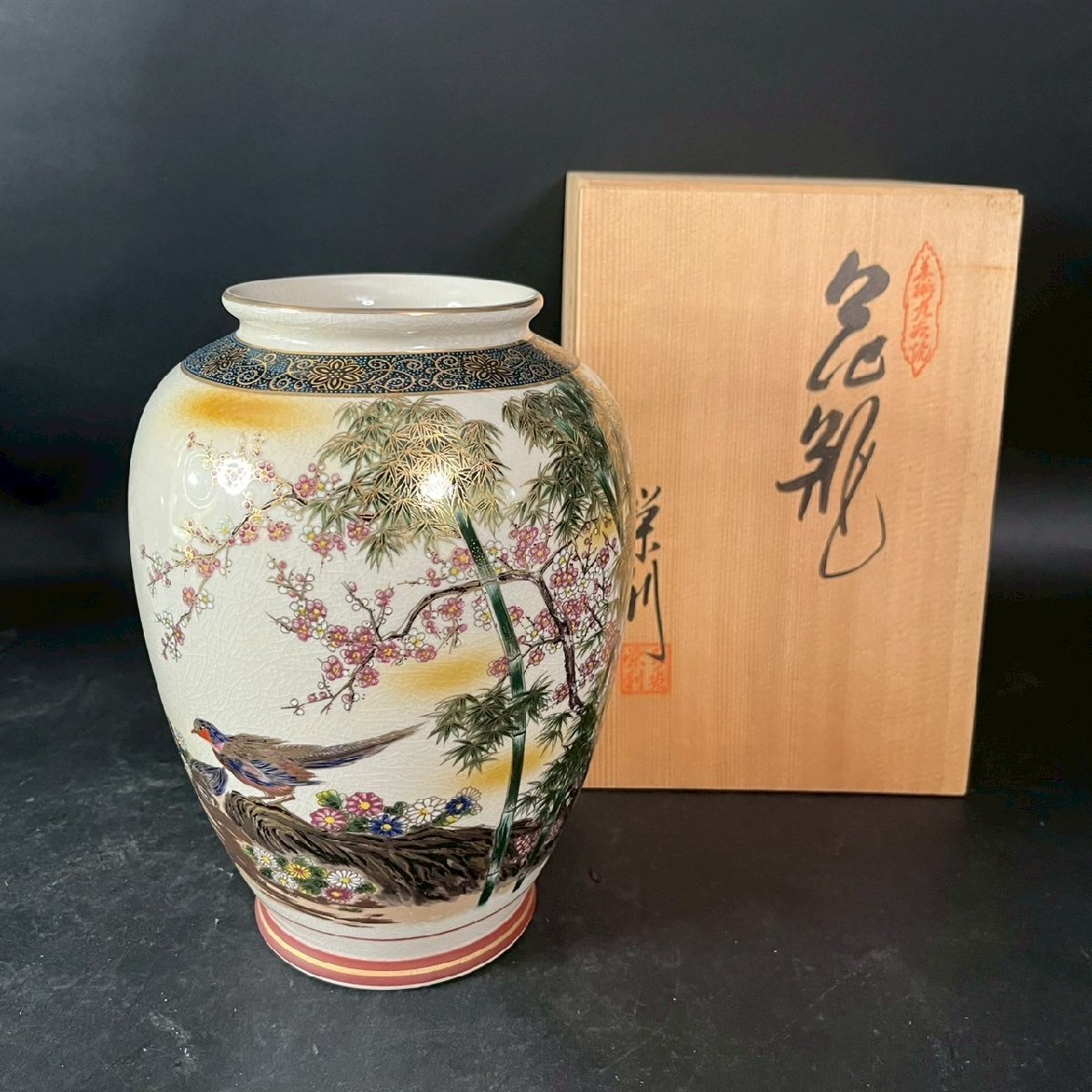 - OM0919-9-7‐3 九谷 栄利 花瓶 花器 花入れ 壺 梅の花 竹 金彩 色絵 陶器 陶芸 伝統 工芸 骨董品 木箱 高さ24.5㎝ 口径10㎝ 80サイズ