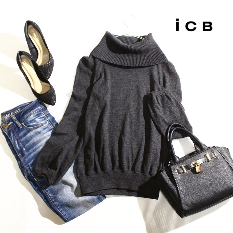 > ICB アイシービー 株) オンワード樫山 秋 冬 毛100% ウール リブ オフタートル ニットセーター S チャコールグレー 可愛い パフスリーブ