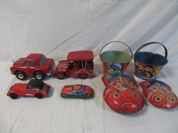 - 1円スタート ブリキ 玩具 ミニカー 三幸製作所製 自動車 ベンツ ジープ 金魚 ミニバケツ 当時物 ヴィンテージ 昭和レトロ 色々8点まとめて
