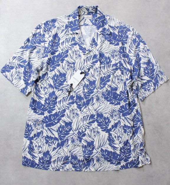 > BAGUTTA★新品3.1万円程度 ビスコース素材のボタニカルプリント柄オープンカラー半袖シャツ「NEW MAUI」サイズL 白×青