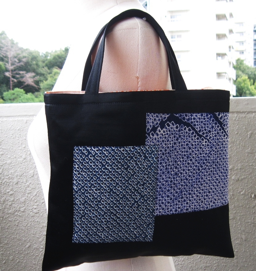 > 布乃言葉*徒然なるままに...”・。トートバック・”御正月を意識して・黒繻子と絹絞り・日本の布達から・青い色(内ポケット無)”
