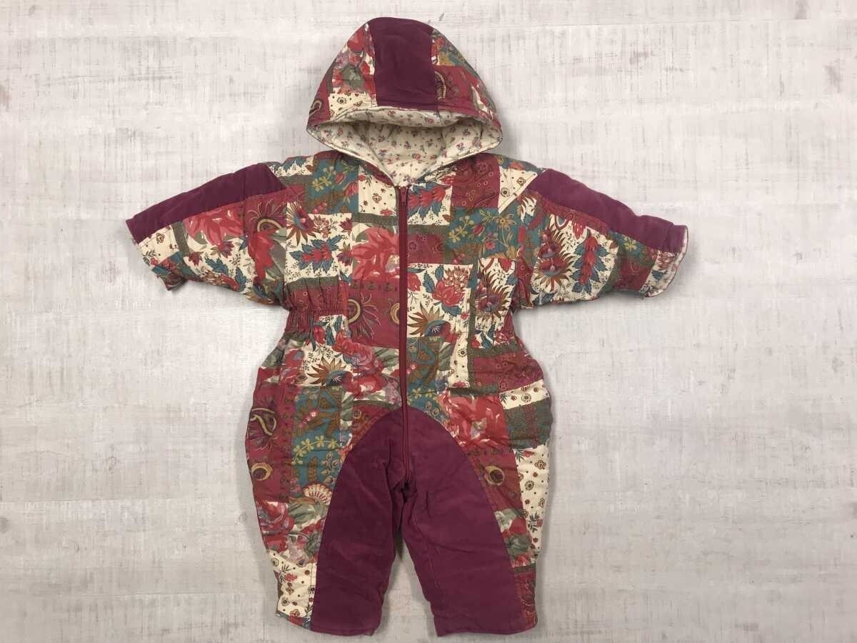 - レトロ オールド ペイズリー ボタニカル 花柄 パッチワーク ボア キッズ 子供服 ベビー オールインワン つなぎ ロンパース パンツ 赤系