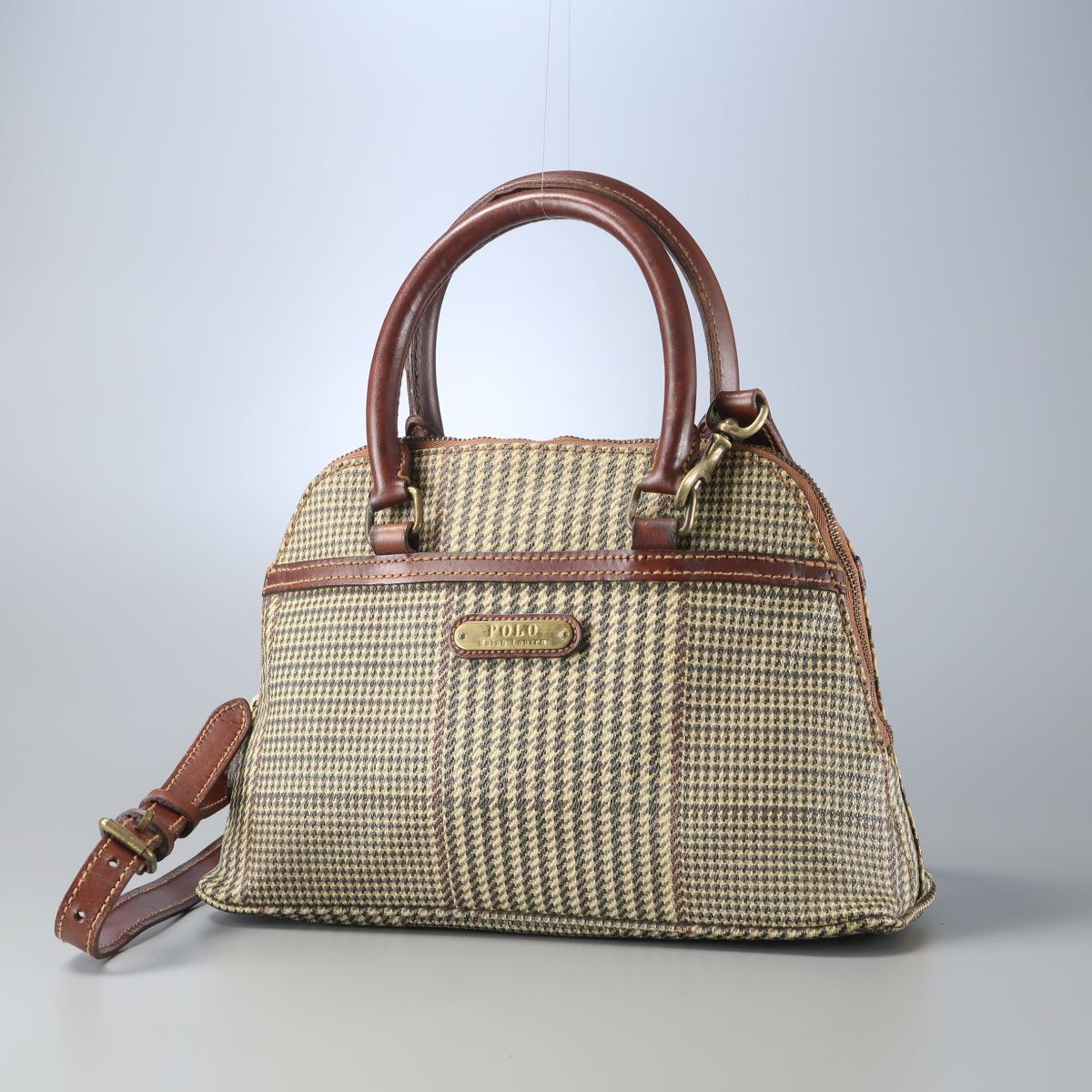 - TJ5581▲Polo Ralph Lauren ポロラルフローレン ブライドルレザー×千鳥格子/チェック柄 PVCキャンバス 2way ハンドバッグ/ショルダー 鞄