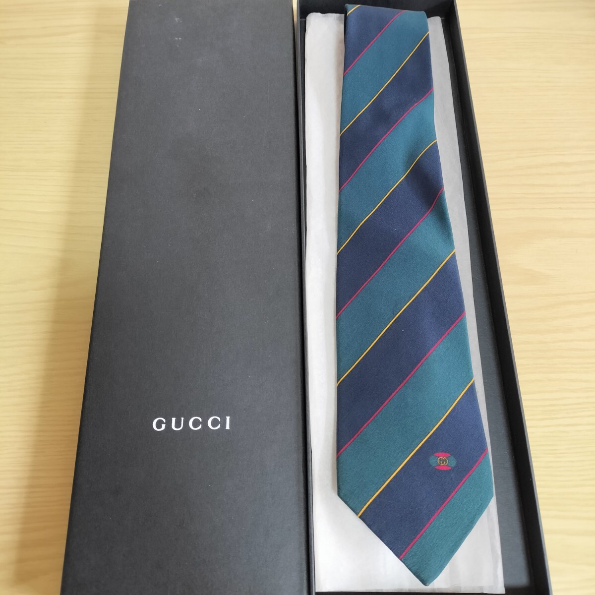 - グッチ(GUCCI)紺色赤黄色線インターロッキングGロゴ模様ネクタイ