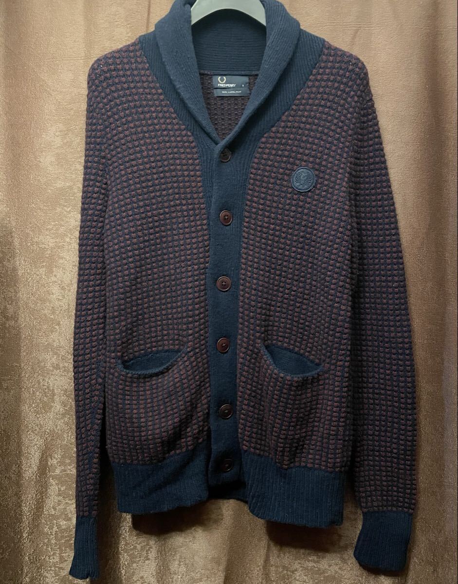 - FRED PERRY ショールカラー ラムウールカーディガン ネイビー×エンジ Sサイズ フレッドペリー カーディガン ニットカーディガン ニット 紺