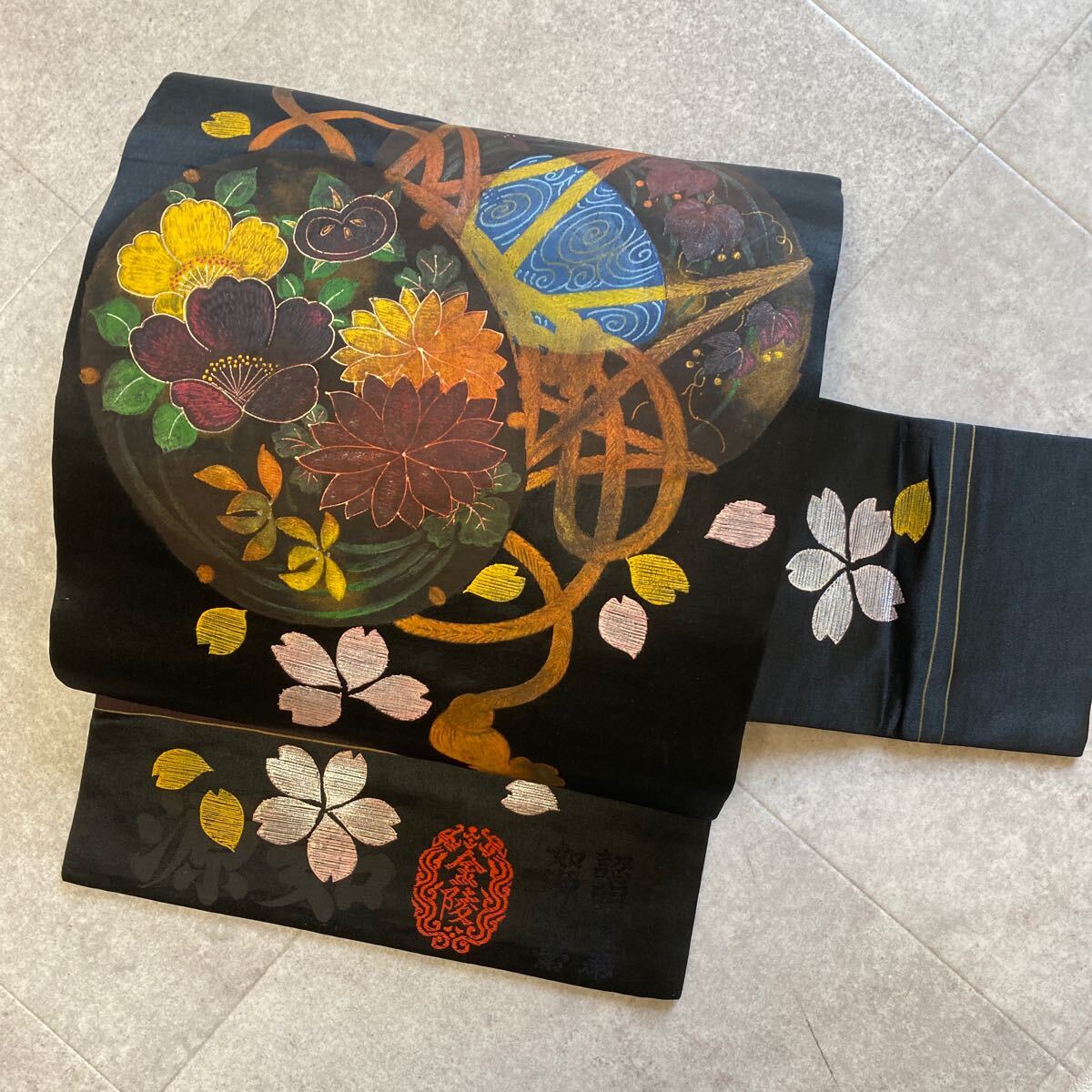- アンティーク 名古屋帯 黒 花鼓 金陵 ペンテ 着物 昭和レトロ 大正ロマン モダン 和洋折衷コーデ リメイク 25こ29-3s