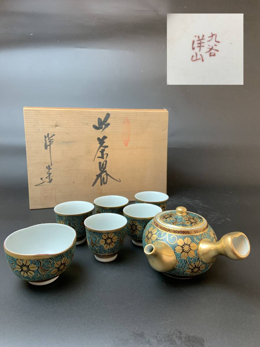 > 久谷焼 久谷洋山 造 金彩花唐草文青粒茶器 急須 湯冷まし 煎茶碗5客揃 茶道具 煎茶道具