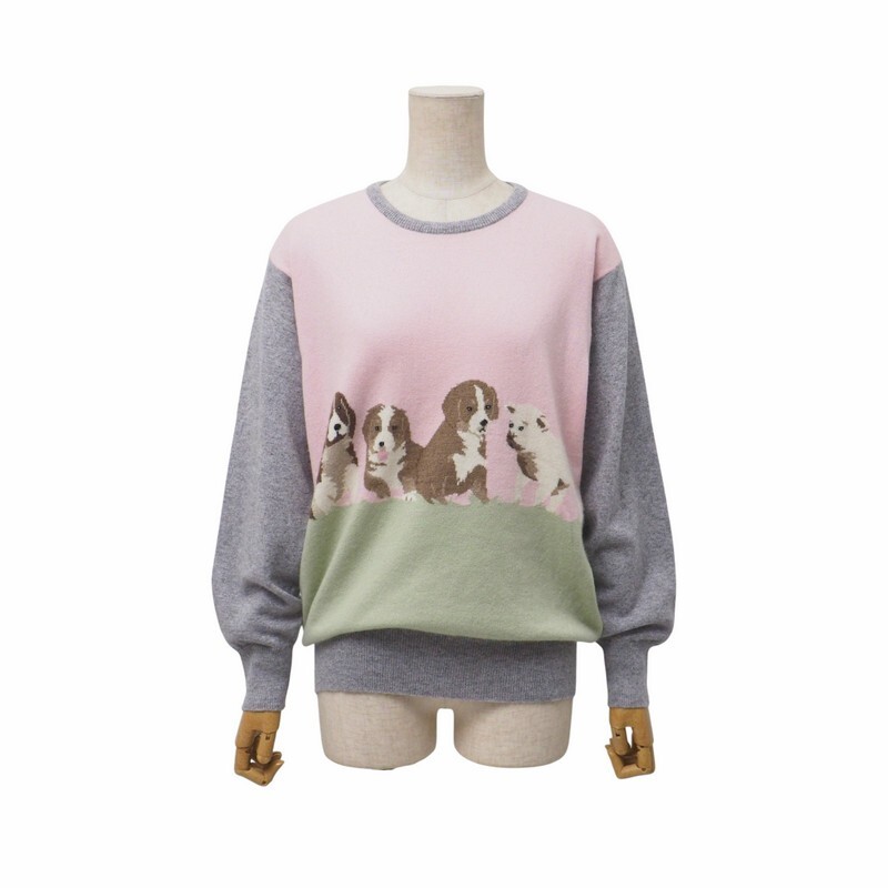 - TJ3604〇EVEMARVEL イヴマーベル*総カシミヤ*犬柄*ニット*セーター*サイズL*ピンク×グリーン×グレー系