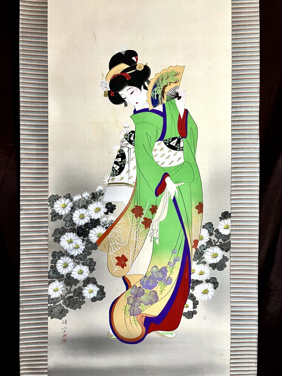 【真作】【仙】鏑木清方「菊」絹本 肉筆 共箱 金泥 美人画 菊花 絵画 掛軸 明治-昭和時代の日本画家 条野採菊の子 東京の人 師: 水野年方