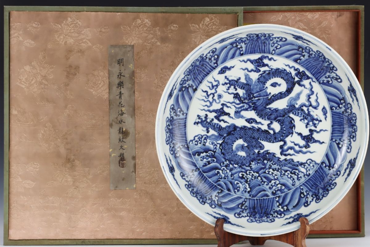 - 【永】明時代 永樂年製 青花海水龍紋大盤 古陶磁器 陶芸 皿 中国陶瓷器 唐瓷 置物擺件 古美術品 古賞物 収集 旧家蔵出 中国唐物 A926