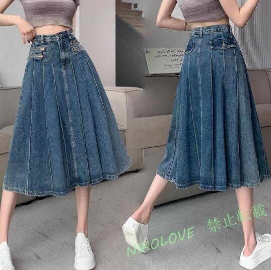 - ☆新品 人気推薦膝丈スカート デニムスカート シンプル カジュアル かわいい 無地 S ブルーサイズ選択可