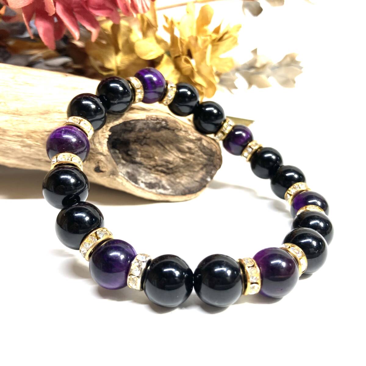 > モリオン&パープル タイガーアイ パワーストーン ブレスレット 天然石ブレス (ゴールド) 10mm メンズ・レディース 厄除け 金運 ☆