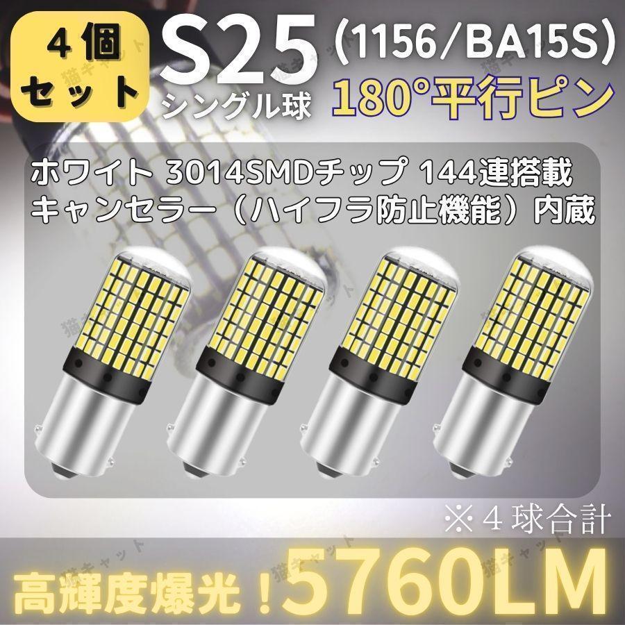 - 爆光 S25 BA15s LED ウインカー バックランプ 白 高輝度 4個 シングル球 180° 平行ピン 抵抗内蔵 ハイフラ防止 5760lm 車検対応 ポン付け