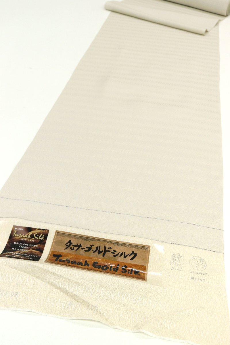 ※こちらの商品にはお仕立てはついておりません。 (布幅:38cm) タッサーゴールドシルクを使用した染め紬着尺をご紹介致します。 しなやかで柔らかな生地は、絹鼠色のお色目でございます。 全体には、ゴールドシルクの糸で縦長の菱模様が織り上げられており、菱の一部が横段状に浮かび上がっております。 ゴールドシルクの糸独特の黄色っぽい光沢感と染め色が相まって、上品な艶のあるお着物に仕上がっております。 無地感覚でお召しいただけますので、帯合わせもし易く、大変お薦めでございます。 野蚕糸の中でも特に光沢と風合いにすぐれた天然のタッサーシルク。 そのタッサーシルクは、吸湿性・保温性・防紫外線にすぐれた古くて新しい、とても人に優しい素材でございます。