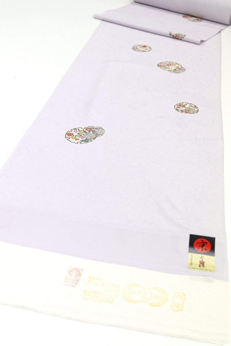 ※こちらの商品にはお仕立てはついておりません。 (布幅:37.5cm) 丹後ちりめん京友禅染め小紋着尺をご紹介致します。 京友禅振興協議会 しっとりとした上質な丹後ちりめんの生地は、紫水晶色のお色目でございます。 生地には氷割れ紋のような地紋が施されており、やや光沢感がございます。 全体には白色、黒茶色、深緑色、赤色、菜種油色などのお色目で、雪輪の中に源氏香文や松竹梅、宝尽くし文が染められております。一部には金彩の縁取りが施され、柄行を引き立たせております。 お着物はもちろん、コートに仕立てられても素敵かと存じます。 -状態・素材:正絹 -落款・証紙:京友禅振興協議会 -参考着用年代: 20代~幅広い年代でお召しいただけます。 -着用時期 :10月~5月