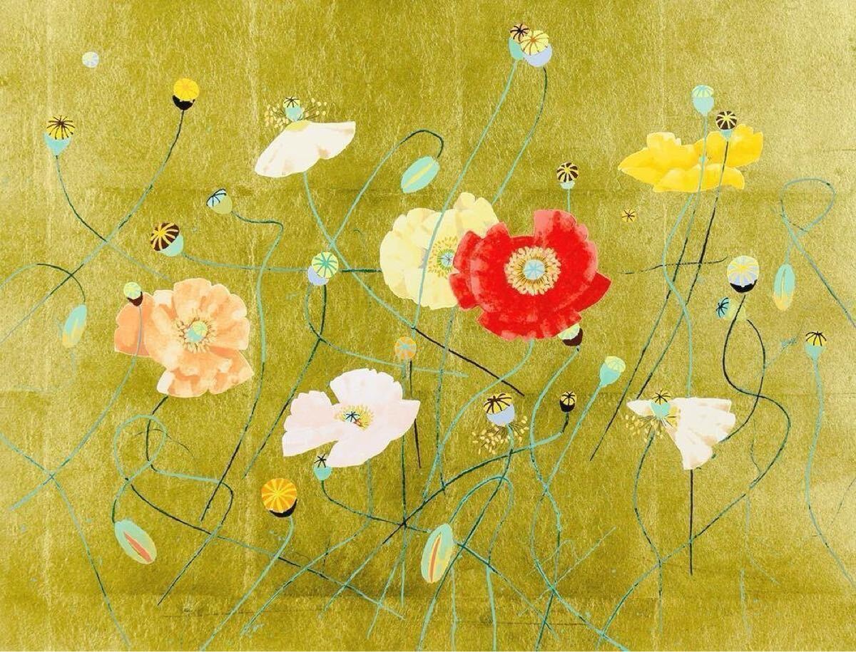 - 真作 堀文子 『 芥子 』 シルクスクリーン 純金箔 日本画 絵画 額装セリグラフ インテリア 共シール 額縁