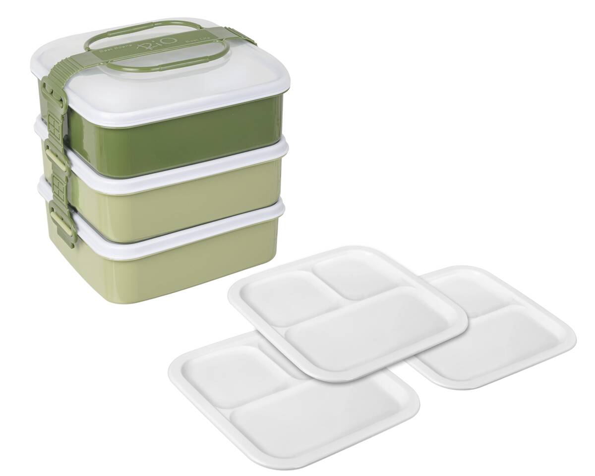 > サンコープラスチック 弁当箱 ピクニックケース リオパック 3段 取り皿3枚付き アースグリーン 約幅20.2×奥行19×高さ20cm
