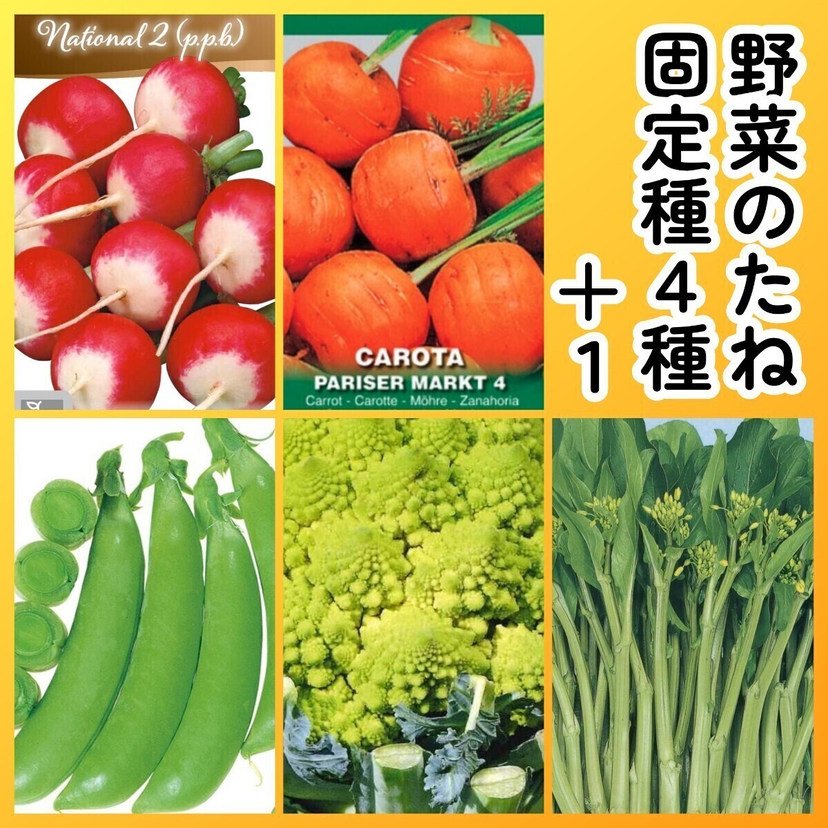 - 匿名配送無料◆固定種野菜種4+1◆ラディッシュ+丸キャロット玉人参+つるなしスナップエンドウ+カリフラワーロマネスコ+オータムポエム