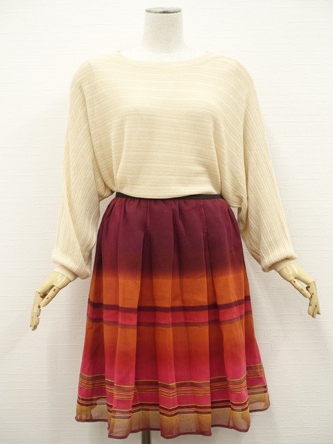 > 美品 Almond oilなど カットソー+膝丈スカート コーディネート2点セット M相当 ベージュ/赤紫×オレンジ×黄 ボーダー ナチュラル 30~40代