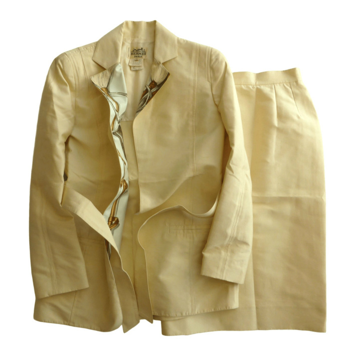 > エルメス (HERMES) シルクスカーフ ラペル テーラード ジャケット スカート セットアップ 38 イエローベージュ ウェア【中古】(中古)
