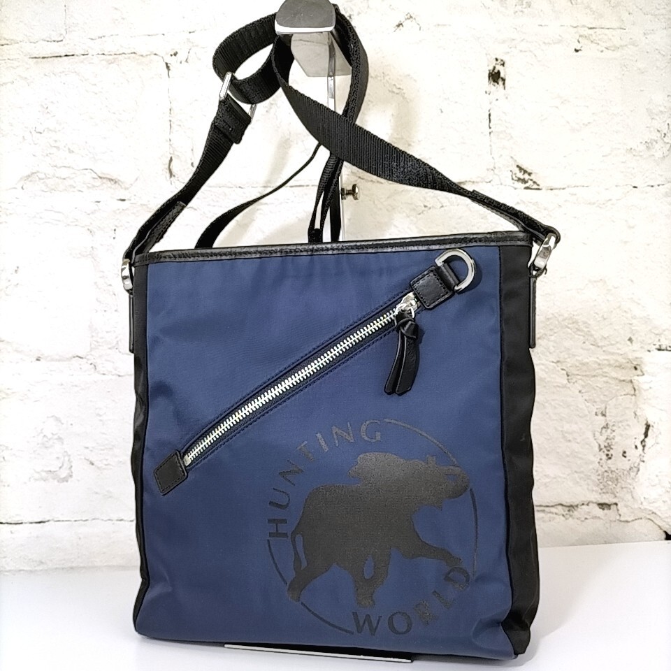 - 【 HUNTING WORLD 】 ハンティングワールド ロゴプリント 一部 レザーショルダー / ボディ バッグ 斜め掛け メンズバッグ 紺系 ネイビー A