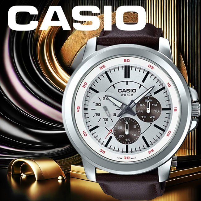 > 新品1円 逆輸入カシオ 入手不可能 インパクトあるビッグサイズ 精悍シルバーフェイス 50m防水 本革ベルト マルチファンクション 腕時計