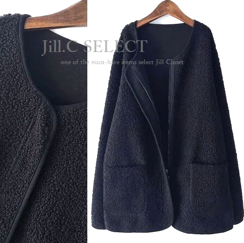 > 新品【送料185円】ノーカラー ボアブルゾン*フロントジッパー&パイピングdesign*オーバーサイズ7719.BLACK