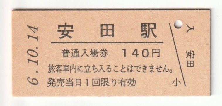 - 平成6年10月14日 信越本線 安田駅 140円硬券普通入場券(日付印刷)