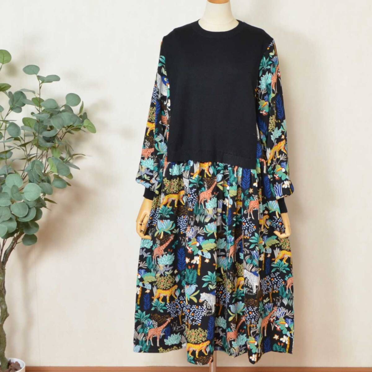 > レイヤード風サファリプリントワンピース 異素材切替 アニマル柄 ゆったりL〜LL 体型カバー TRUBE 長袖 N83-060