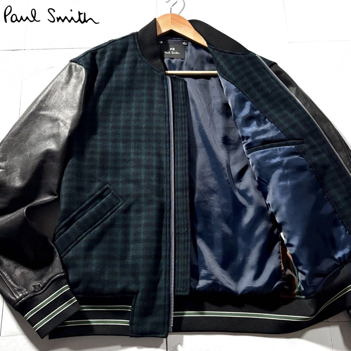 > 極美品●近年品 Paul Smith ポールスミス やぎ革 切替 スタジャン ジャケット 本革 ウール系 ゴートレザー チェック総柄 裏地ブルー M-L