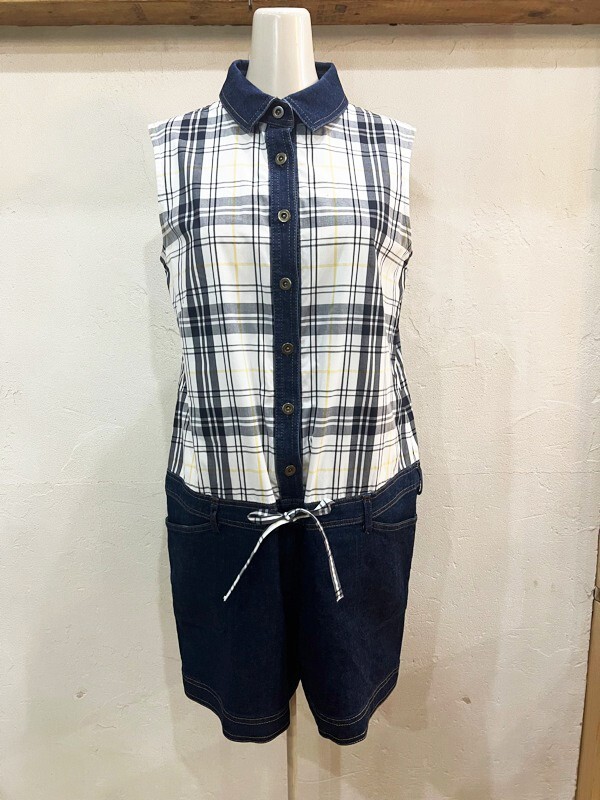 > B6★Yorkland/ヨークランド デニム×チェックショート丈オールインワン ロンパース ネイビー×ホワイト系 レディース 9AR カジュアル★